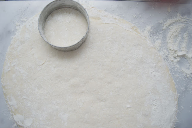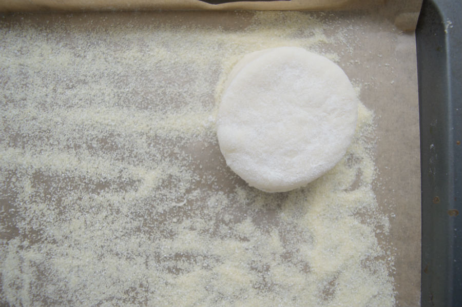 - Cut discs using a 6cm diameter cookie cutter. Place them in a baking dish wrapped with some parchment paper, and dusted with semolina or cornmeal.
