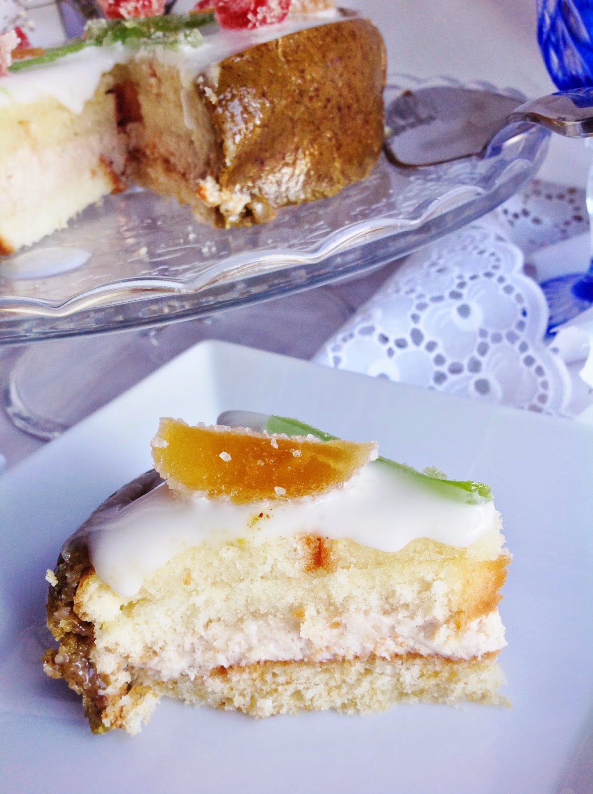 No estaba yo muy segura de cómo saldría pero creo que ha sido espectacular cuando lo he probado y he sentido esa suavidad de la ricotta mezclada con la canela, el glaseado de limón que le da ese toque cítrico que tanto me gusta en los postres y ese bizcocho, tan sencillo y a la vez tan aromático de naranja. También me ha resultado muy original el mazapán de pistacho, está bastante bueno y el toque de este fruto seco le viene estupendamente. Hoy lo he comido para desayunar ya que tenía que hacerle la sesión de fotos y al partir el trocito y comérmelo ha sido todo un placer mañanero.