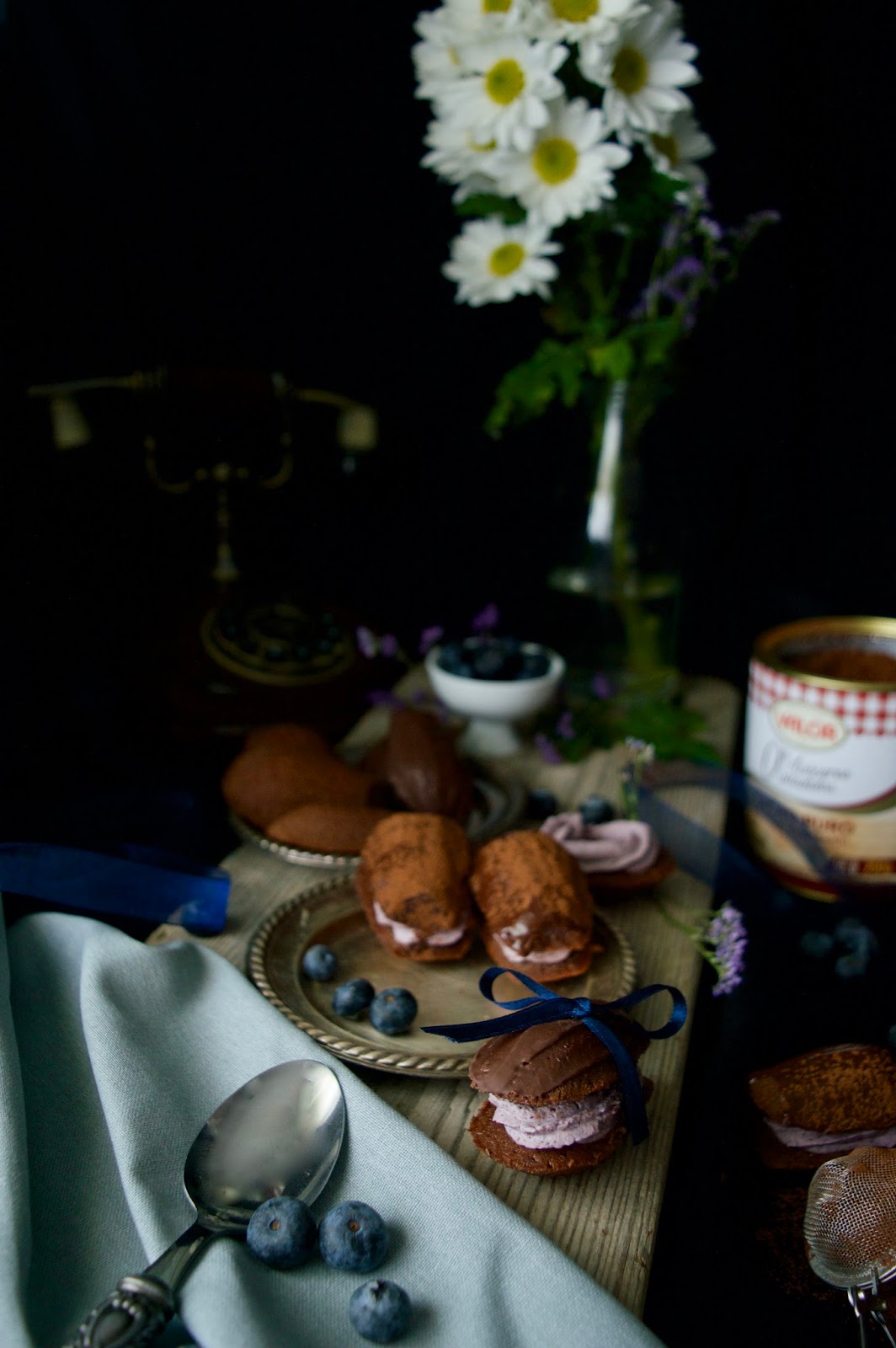 - Take half of the madeleines and fill with blueberry cream. Leave a blank in the middle to put 2 blueberries inside.